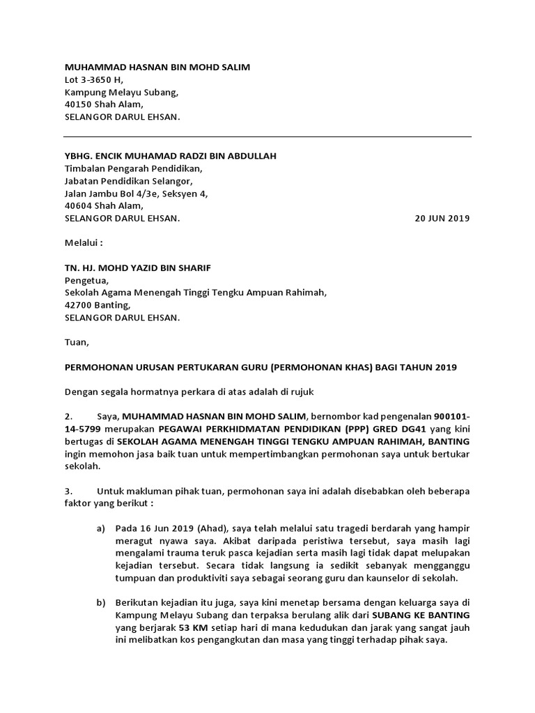 Contoh Surat Rayuan Pertukaran Guru Egtukar Pdf